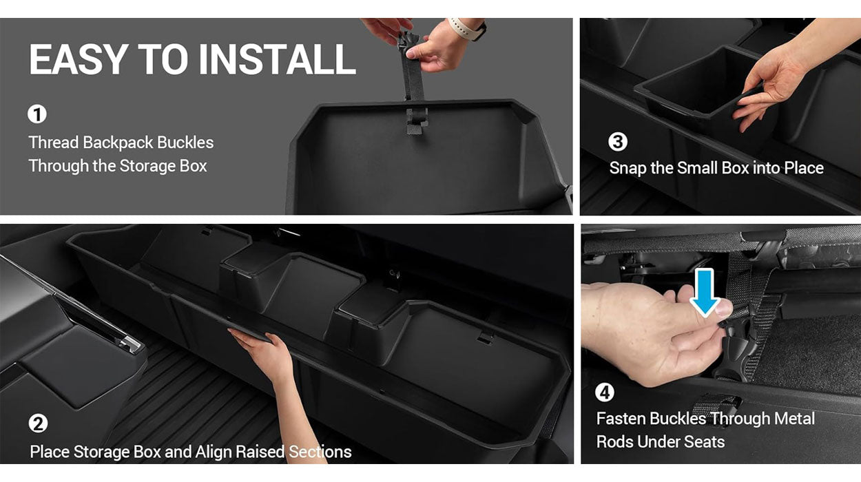 - Easy Installation: Set up the storage bin under your Cybertruck's rear seat in just minutes with our step-by-step guide - no tools required. The included nylon straps secure it firmly in place, preventing movement and noise. Enjoy enhanced convenience and safety with this easy-to-install, reliable storage solution.